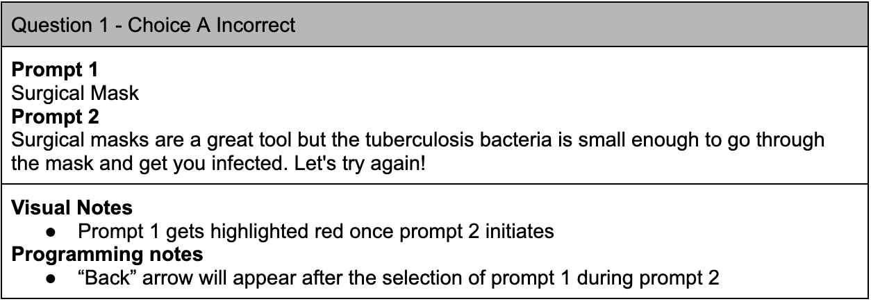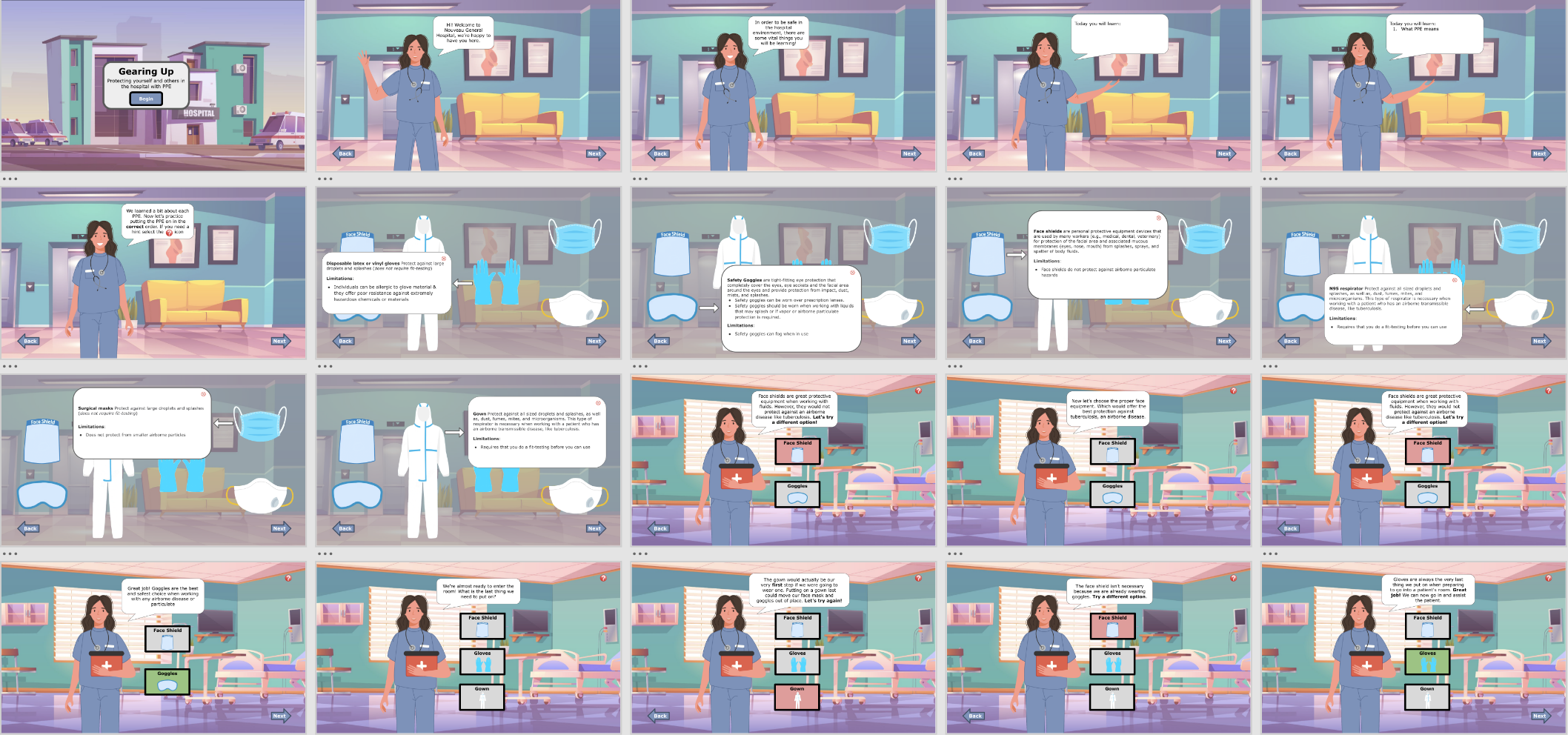 Through feedback and the testing of the prototype we found inconsistencies with certain interactions and buttons that were then fixed. Initially the interactive activity was a drag-and-drop where the learner had to place the PPE in the proper order on the nurse but the education SME recommended changing the activity to something that follows a linear story. They also recommended adding a hint button to help the learner in case they get stuck.